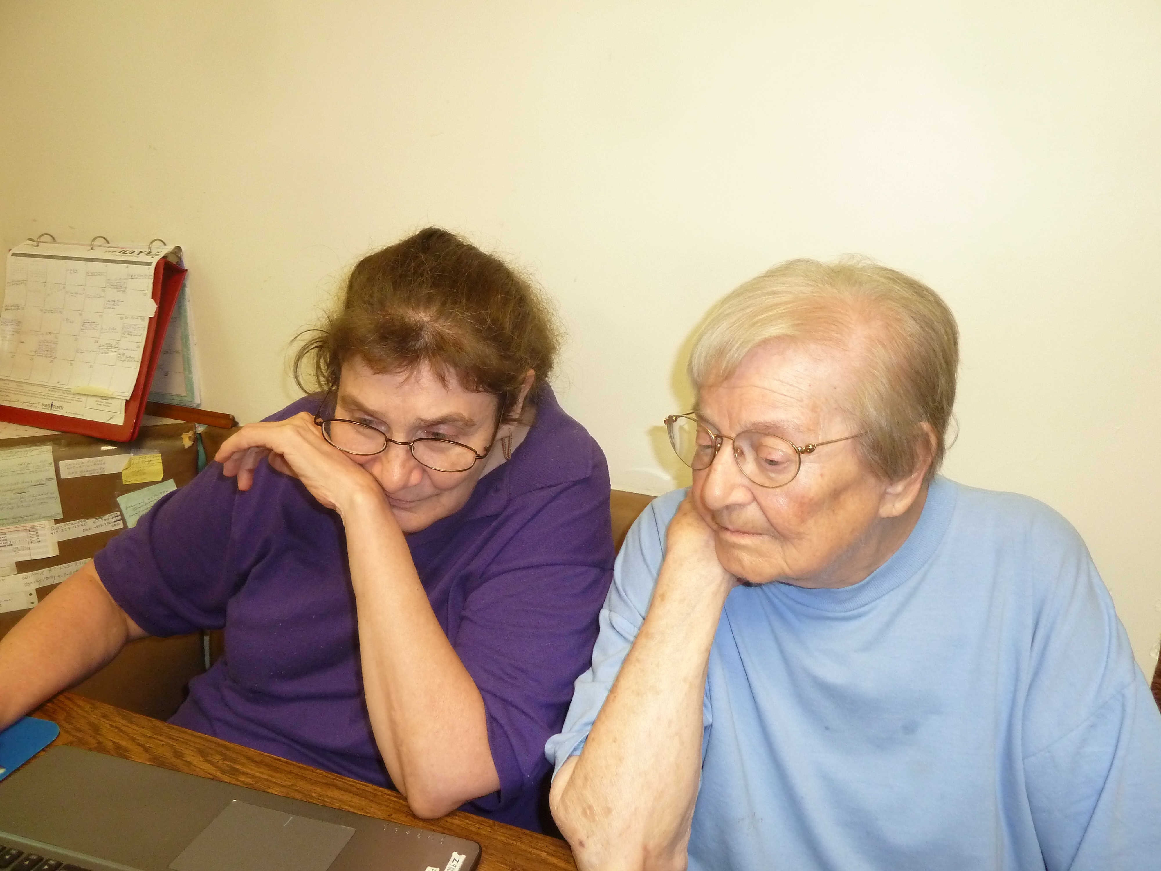 Barb and Louise sorting party photos at her kitchen table. July 2016