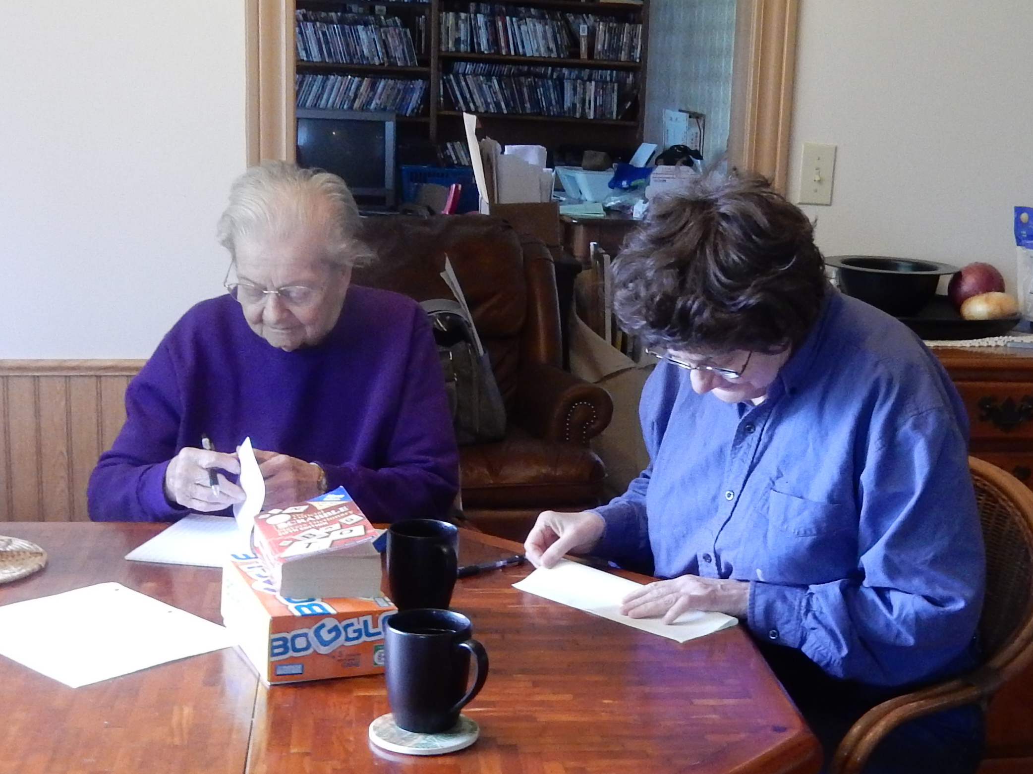 Louise and Barb playing Boggle in Barb's kitchen