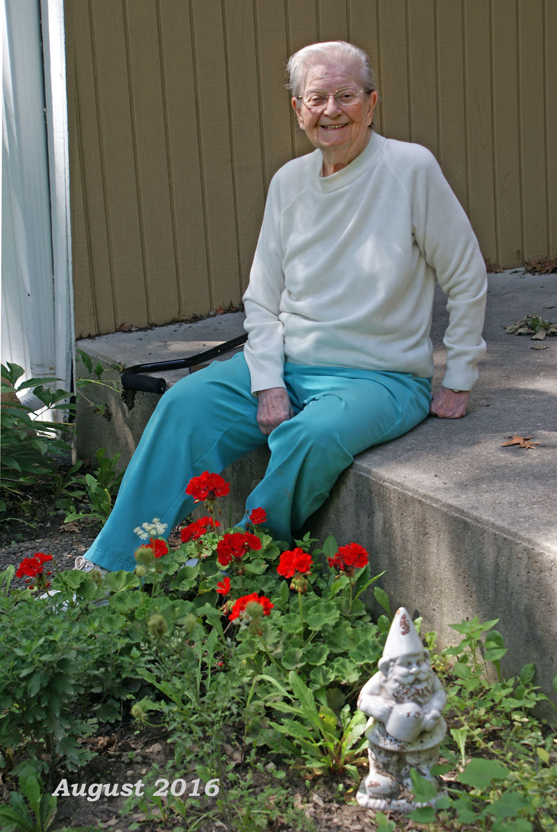 Louise on her front porch checking out the flowers. Aug 2016