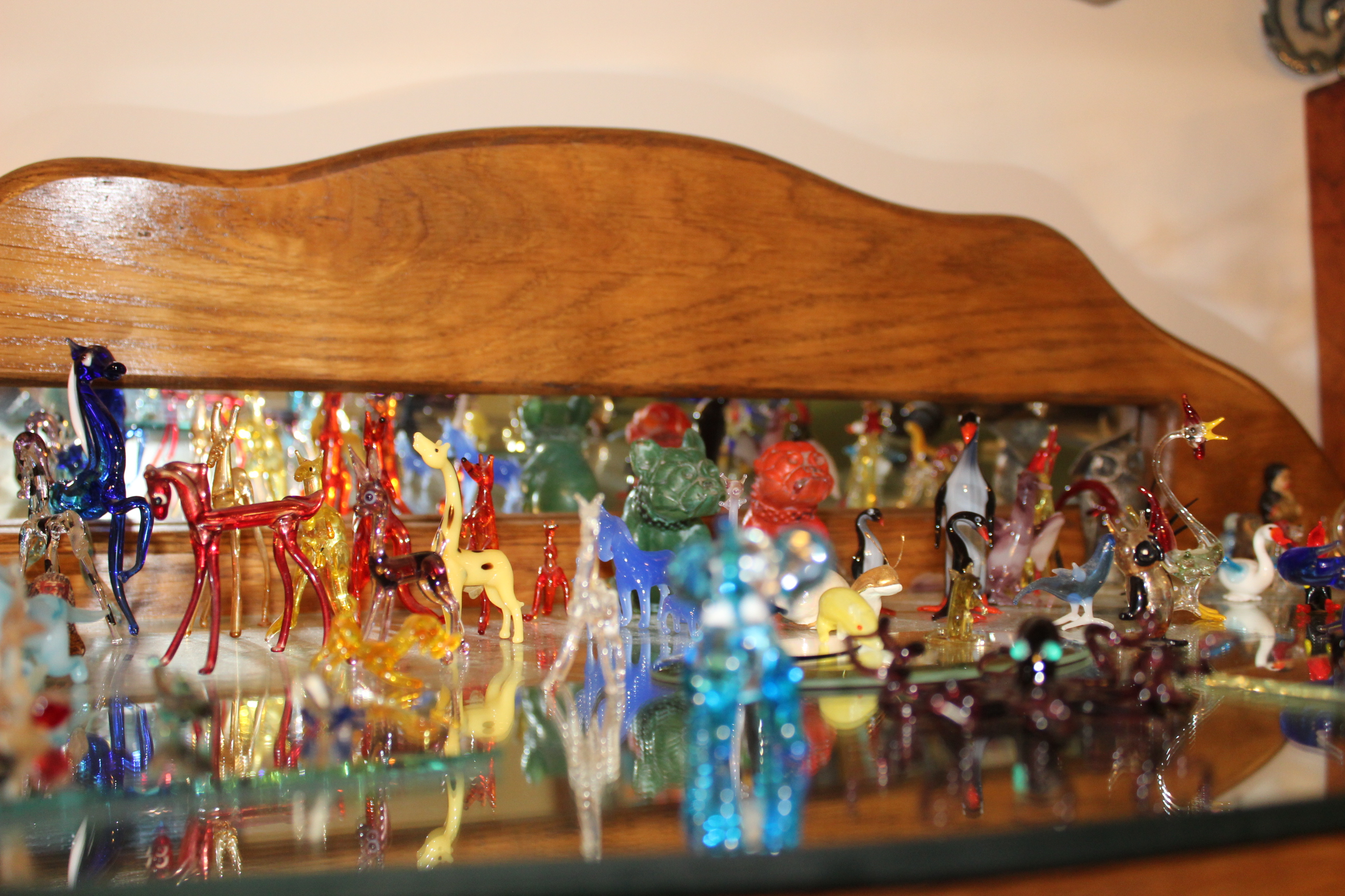 One shelf of 6 of Louise's glass and ceramic animal collection
